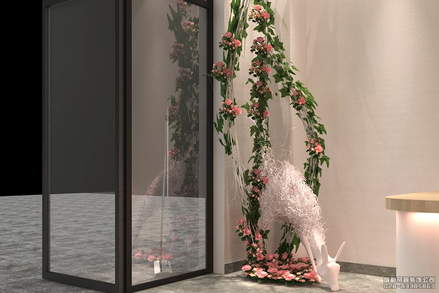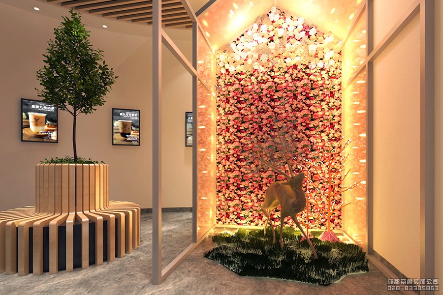 而在奶茶店休息区的另一角则是设计了一个独立景观空间,里面密密麻麻的装饰着鲜艳花朵,再配以“白鹿”这种有着品牌意义的吉祥物,很好的诠释了连锁奶茶店鹿角戏这个品牌形象,同时也寓意着这是一家高端连锁奶茶店。