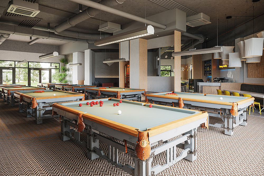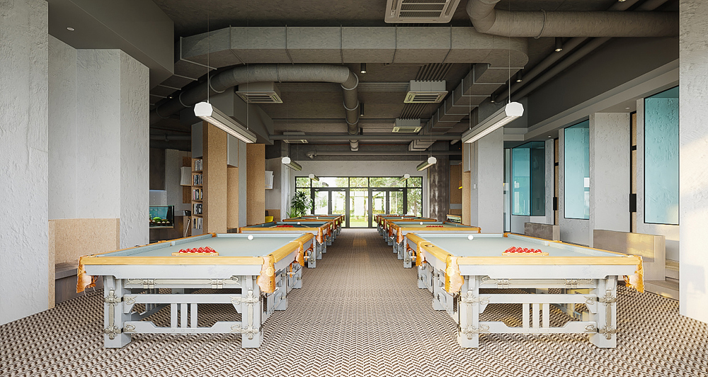 台球俱乐部装修为了省钱和赶工期,通常都会把地毯作为地面的优先装饰材料,各方面优势也最为明显,主要是施工简单又能出效果,后期地面发生破损后维修更换起来方便。